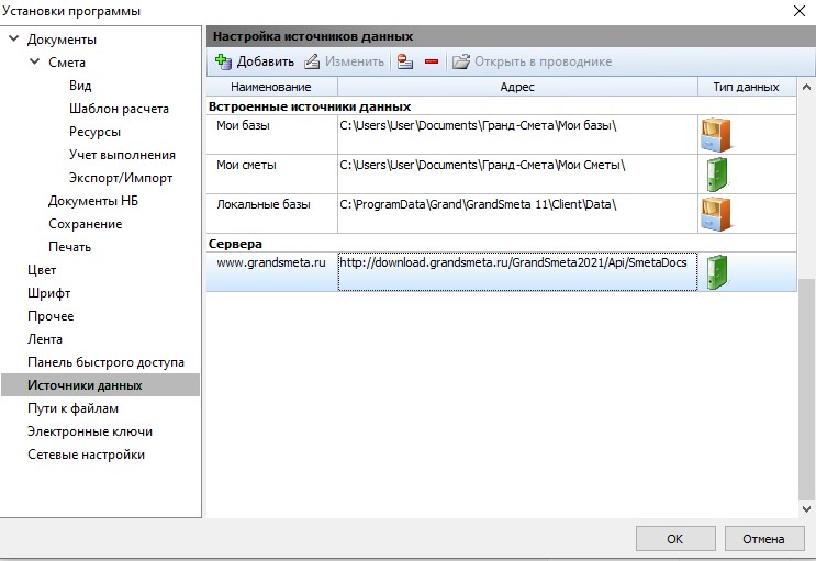 В результате в списке появляется новый источник данных: сервер www.grandsmeta.ru.