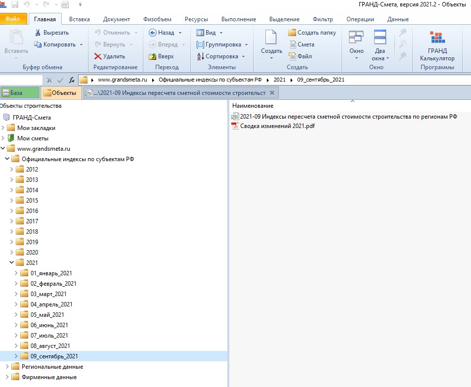 Здесь каждый месяц появляется очередная новая папка, куда записаны два файла. Во-первых, это сборник индексов в формате ПК «ГРАНД-Смета» и кроме этого, ещё текстовый файл с названием Сводка изменений. Обычно в течение месяца файл с индексами неоднократно обновляется. И в файле с названием Сводка изменений приводится полная история событий, которые произошли за этот месяц с индексами по всем российским регионам.