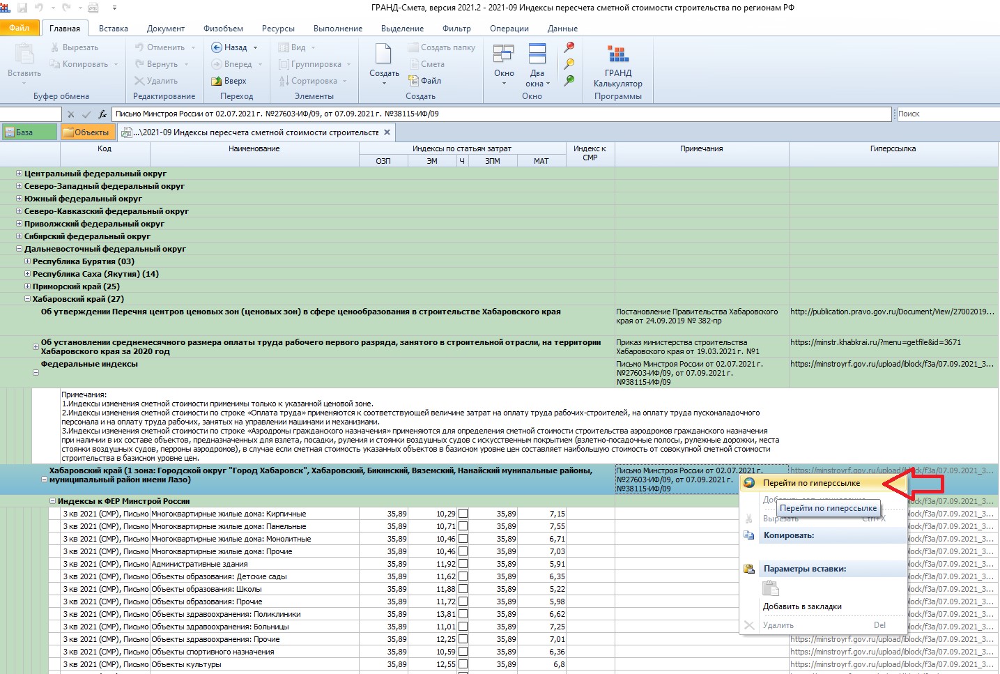 Для каждой группы индексов здесь обязательно указывается утверждающий нормативный документ, прикреплено его изображение и даётся ссылка на официальный сайт с его публикацией. При необходимости можно щёлкнуть правой кнопкой мыши по нужной строке и выбрать в появившемся контекстном меню команду Перейти по гиперссылке.