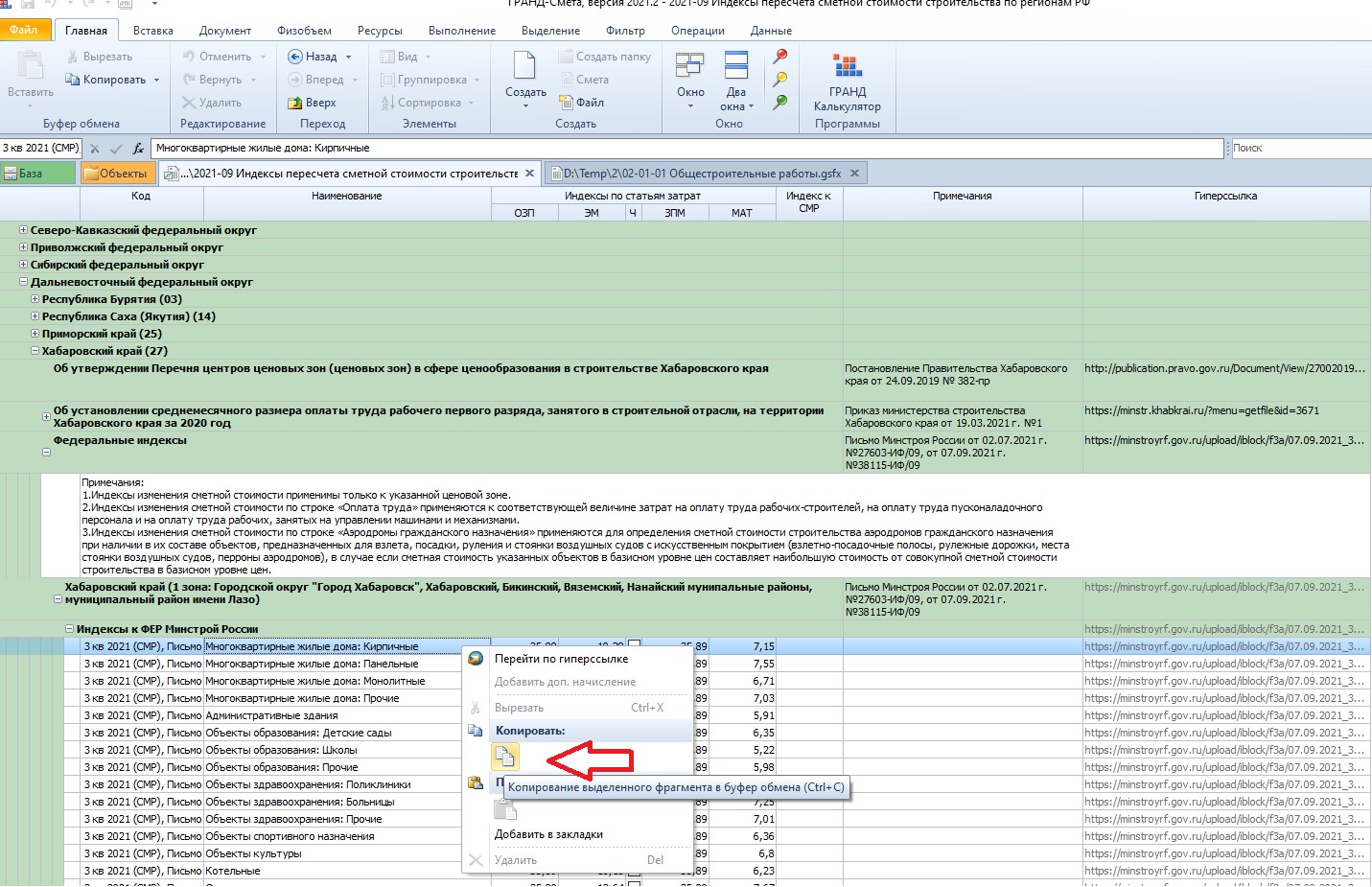 Для добавления индекса непосредственно в локальную смету, его необходимо предварительно скопировать, стандартным для Windows способом, нажав на правую кнопку мыши и далее «Копировать».