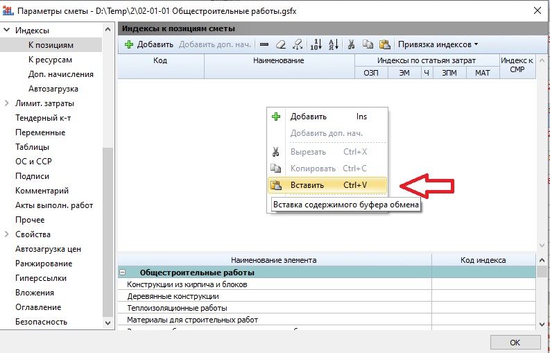 Далее перейти на вкладку Индексы в параметрах сметы (Клавиша F6->Индексы->К позиции) правой кнопкой мыши «Вставить».