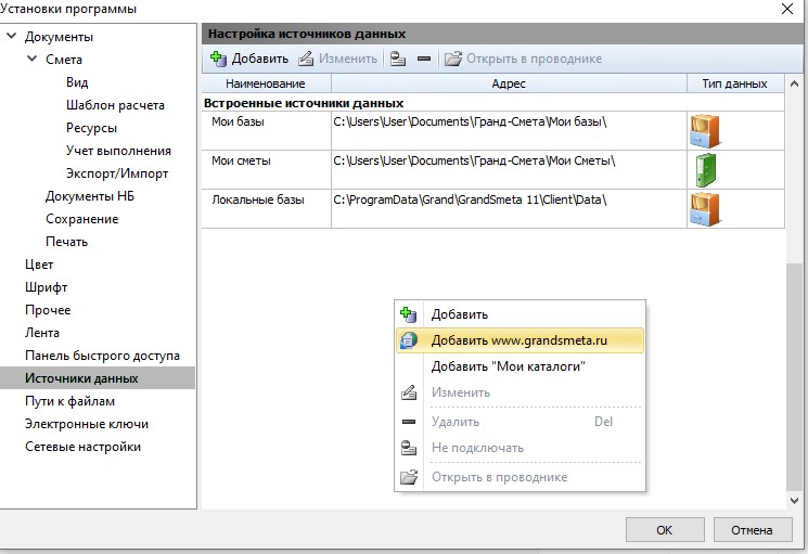 Для этого в программе требуется перейти на вкладку Файл , нажать там кнопку Установки и далее в появившемся окне с установками программы открыть раздел Источники данных . Здесь необходимо на свободной области экрана щёлкнуть правой кнопкой мыши и выбрать из списка команду Добавить www.grandsmeta.ru. Это сервер, на котором хранятся сборники индексов пересчёта и каталоги текущих цен для ПК «ГРАНД-Смета».