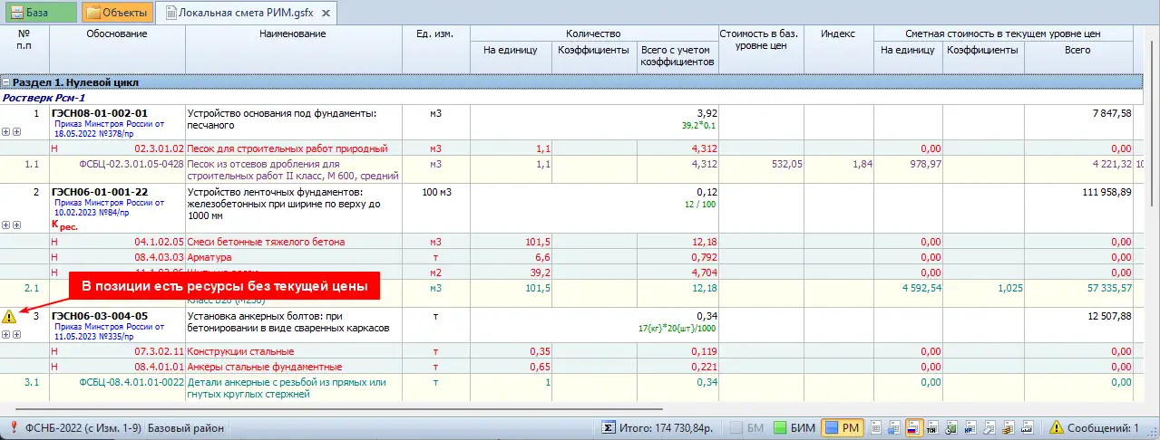 Позиции в смету добавлены не из нормативной базы ФСНБ-2022