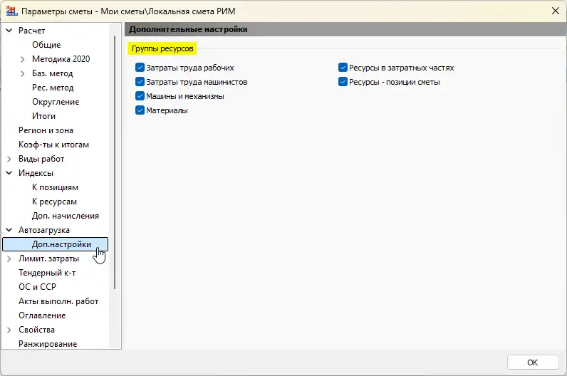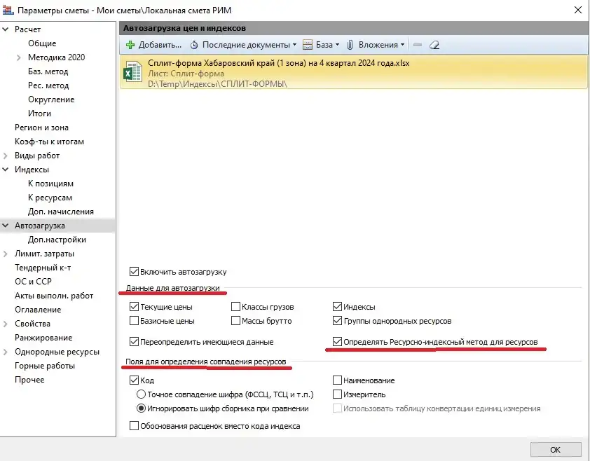 Необходимые настройки для загрузки (автозагрузки) текущих цен и индексов по группам однородных ресурсов из сплит-формы: