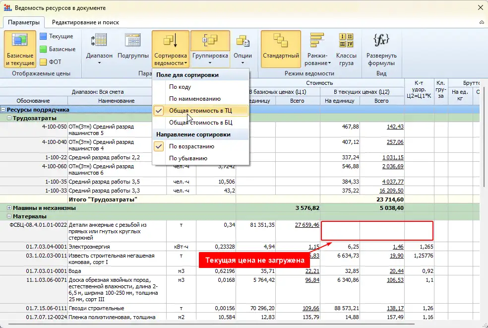 В окне ведомости ресурсов по смете (вкладка Ресурсы → Ресурсы в смете, клавиша +) по всем ресурсам должна быть задана цена в колонке Стоимость → В текущих ценах → На единицу.