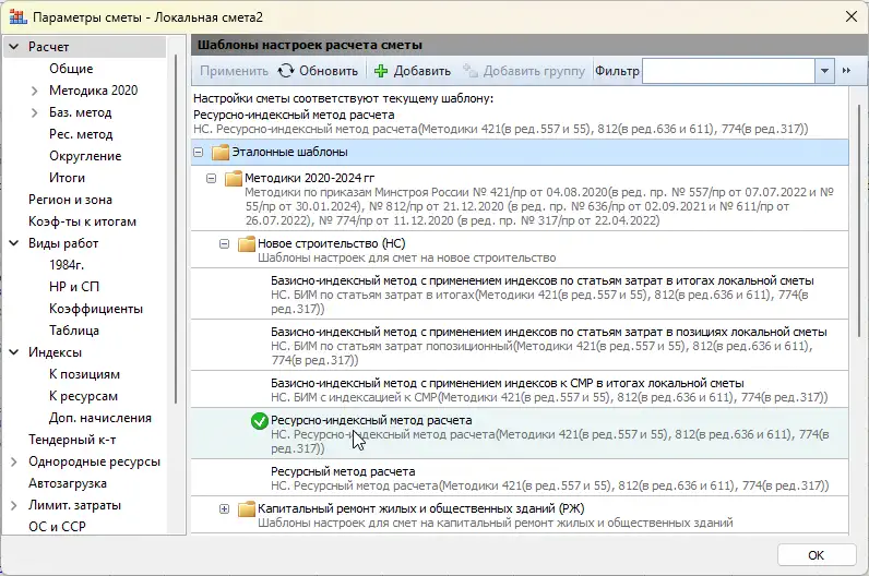Выберите шаблон настроек расчёта для ресурсно-индексного метода расчёта.