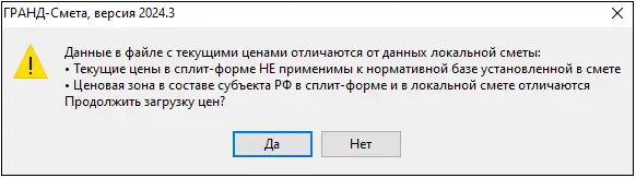 При загрузке цен из сплит-формы в такой ситуации программа «ГРАНД-Смета» выдаёт предупреждение: