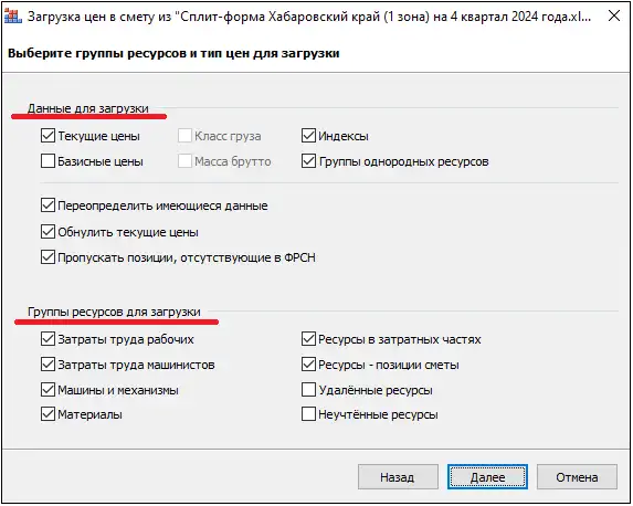- В группе опций Данные для загрузки включите опции: Текущие цены, Индексы, Группы однородных ресурсов. Также включите опции Переопределить имеющиеся данные, Обнулить текущие цены и Пропускать позиции, отсутствующие в ФРСН.