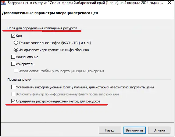 - В группе опций Поля для определения совпадения ресурсов включите только опцию Код с дополнительной опцией Игнорировать при сравнении шифр сборника. Опции Наименование и Измеритель выключите.