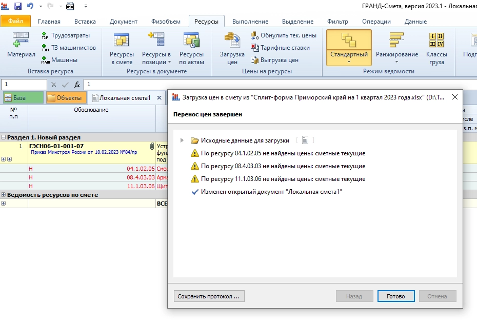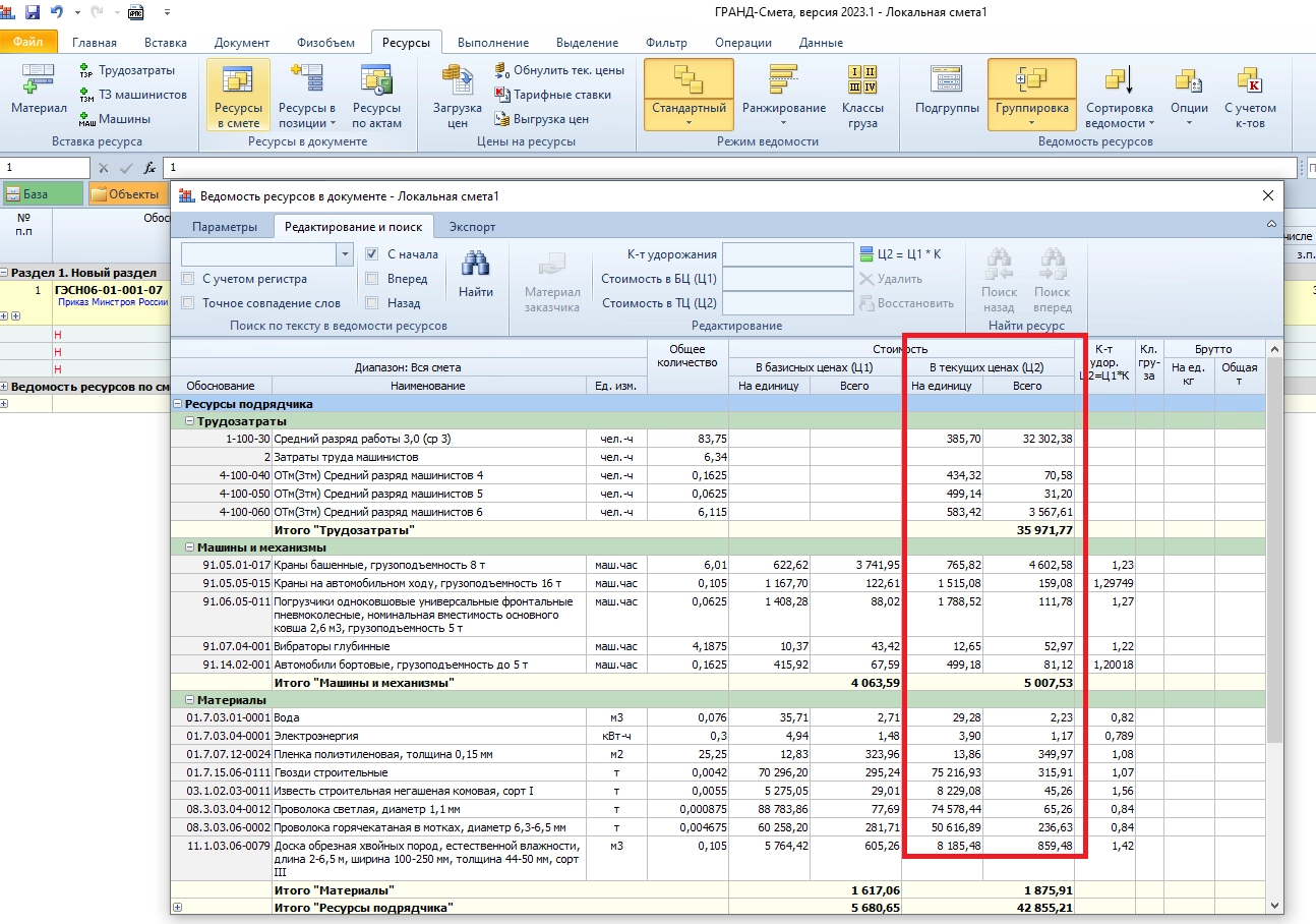 Если вы прошли все шаги, то в ведомости ресурсов, это кнопка Ресурсы в смета на панели инструментов Ресурсы в колонке Стоимость в текущих ценах вы должны увидеть загруженные или рассчитанные текущие сметные цены по всем ресурсам.