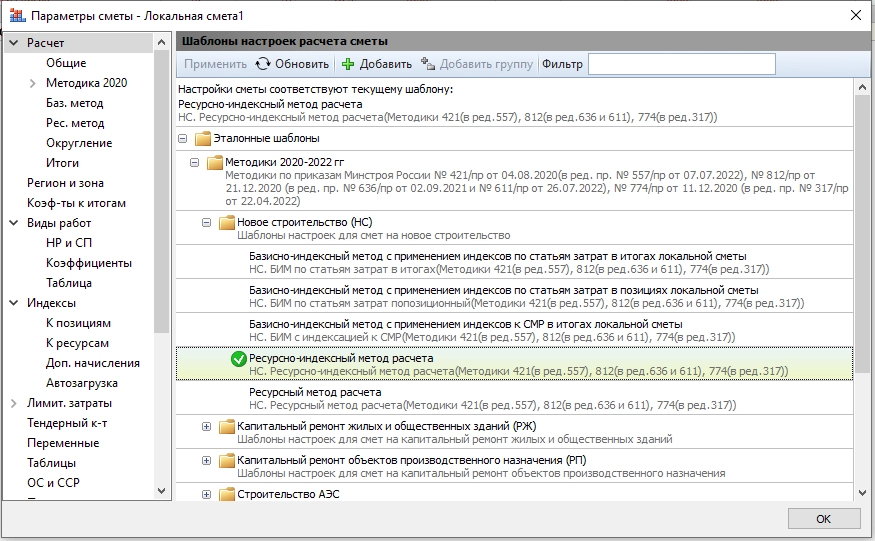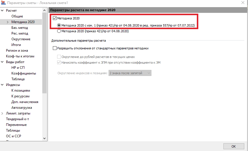 В параметрах сметы должен быть включен расчёт по Методике 2020 с изм. 1 в соответствии с приказом 421/пр от 04.08.2020 в ред. приказа 557/пр от 07.07.2022.