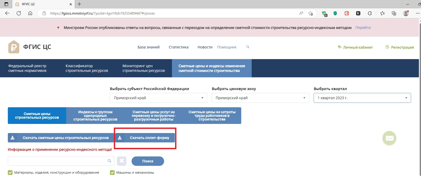 Сплит-форма содержит данные сразу трёх разделов – текущие сметные цены строительных ресурсов, индексы к группам строительных ресурсов, а так же сметные цены на затрату труда работников.