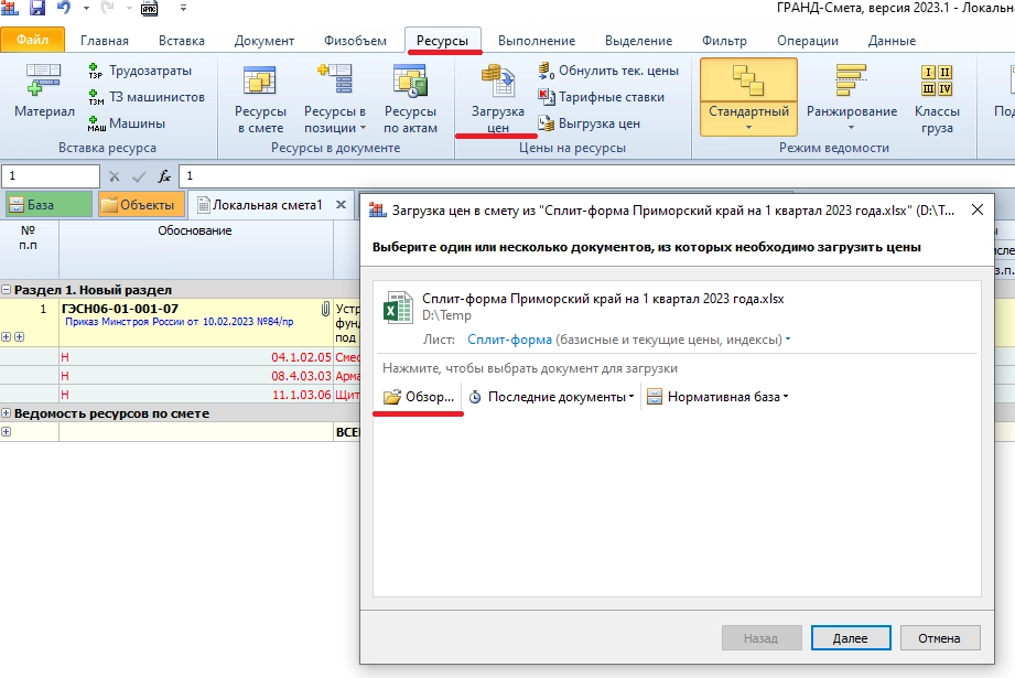 На первом шаге выбираем сплит-форму для загрузки в форме загрузки цен в смету команда Загрузка цен на вкладке Ресурсы, далее команда Обзор выбираем необходимый файл сплит-формы.
