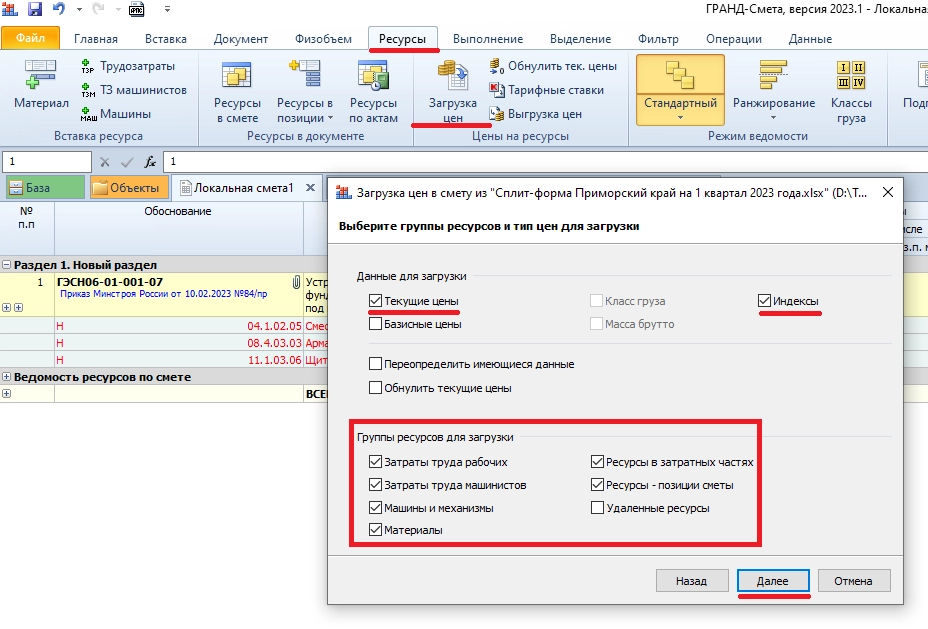 На втором шаге необходимо убедиться, чтобы были загружены данные по текущим ценам и индексам, базисные цены не должны загружаться. Данные загружаем для всех групп ресурсов, кроме удалённых ресурсов.