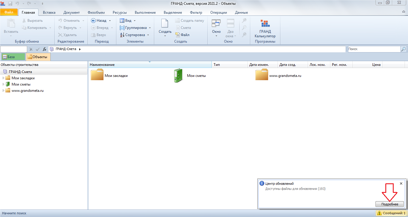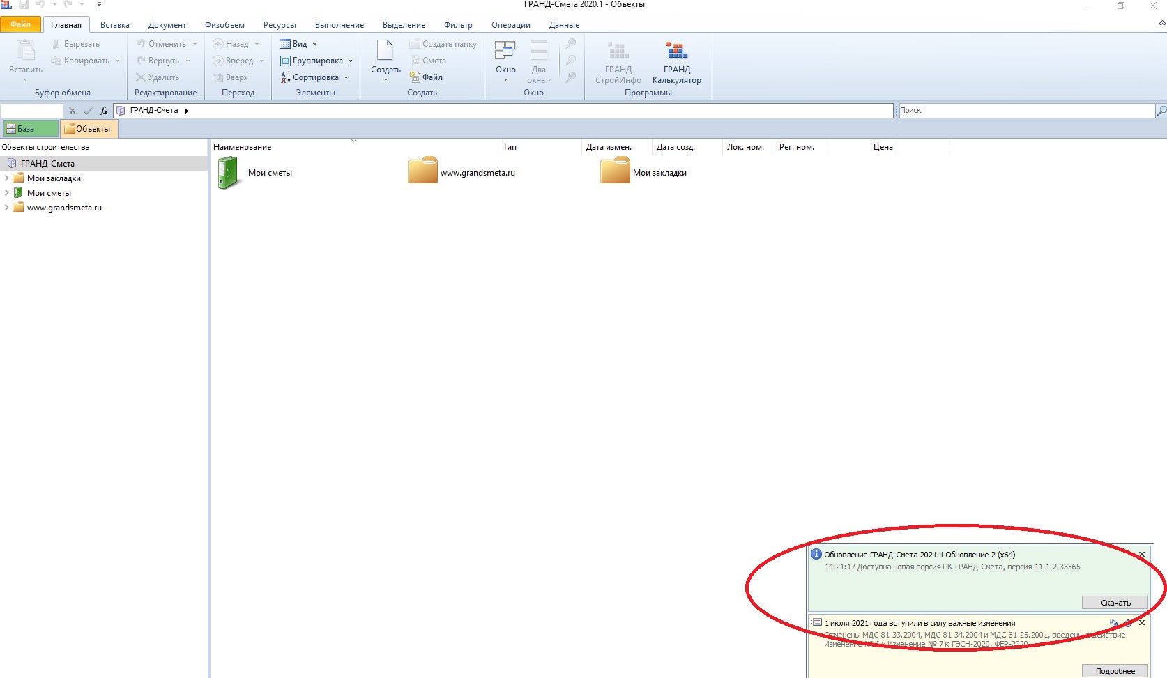 С выходом версии ПК «ГРАНД-Смета 2021.1» прекратил существование «Менеджер обновления», который верой и правдой служим нам всем с 2011 года. По факту с 2016 года ПК «ГРАНД-Смета» сама отслеживает появление доступных обновлений на рабочий эл. ключ обновления версий программного комплекса, а так же визуально помечает нормативные базы в списке, если по ним есть обновления, для этого лишь требуется доступ к сети интернет. К примеру, при запуске ПК «ГРАНД-Смета» при появлении новой версии в правом нижнем углу в сервисе сообщений появляется сообщение - доступна новая версия ПК «ГРАНД-Смета» с указанием номера версии и кнопкой «Скачать».