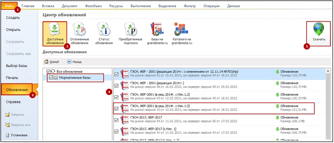 *Для установки обновления через программу ГРАНД-Смета необходим доступ к сети Интернет. На время установки рекомендуется отключить антивирусное и другое защитное ПО. - Открыть меню «Файл» (1) -> «Обновления» (2), нажать на кнопку «Доступные обновления» (3), выбрать необходимую для установки базу, либо выбрать все базы* (4) и нажать на кнопку «Скачать» (5).